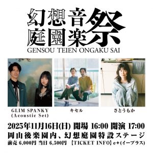 幻想庭園音楽祭 庭園内で音楽鑑賞をお楽しみください。 ◆開催期間/令和7年11月16日(日曜日) ◆時間/開場16:00/開演17:00 ◆料金/前売6,000円 当日6,500円 ◆会場/流店南側開放芝生 ※後楽園入園の際は、別途入園料が必要 ※中学生以上は幻想庭園音楽祭のチケットが必要 ※小学生以下の方は幻想庭園音楽祭チケットをお持ちの方と同伴の場合、入場可 [お問い合わせ]YEBISU YA PRO 086-222-1015