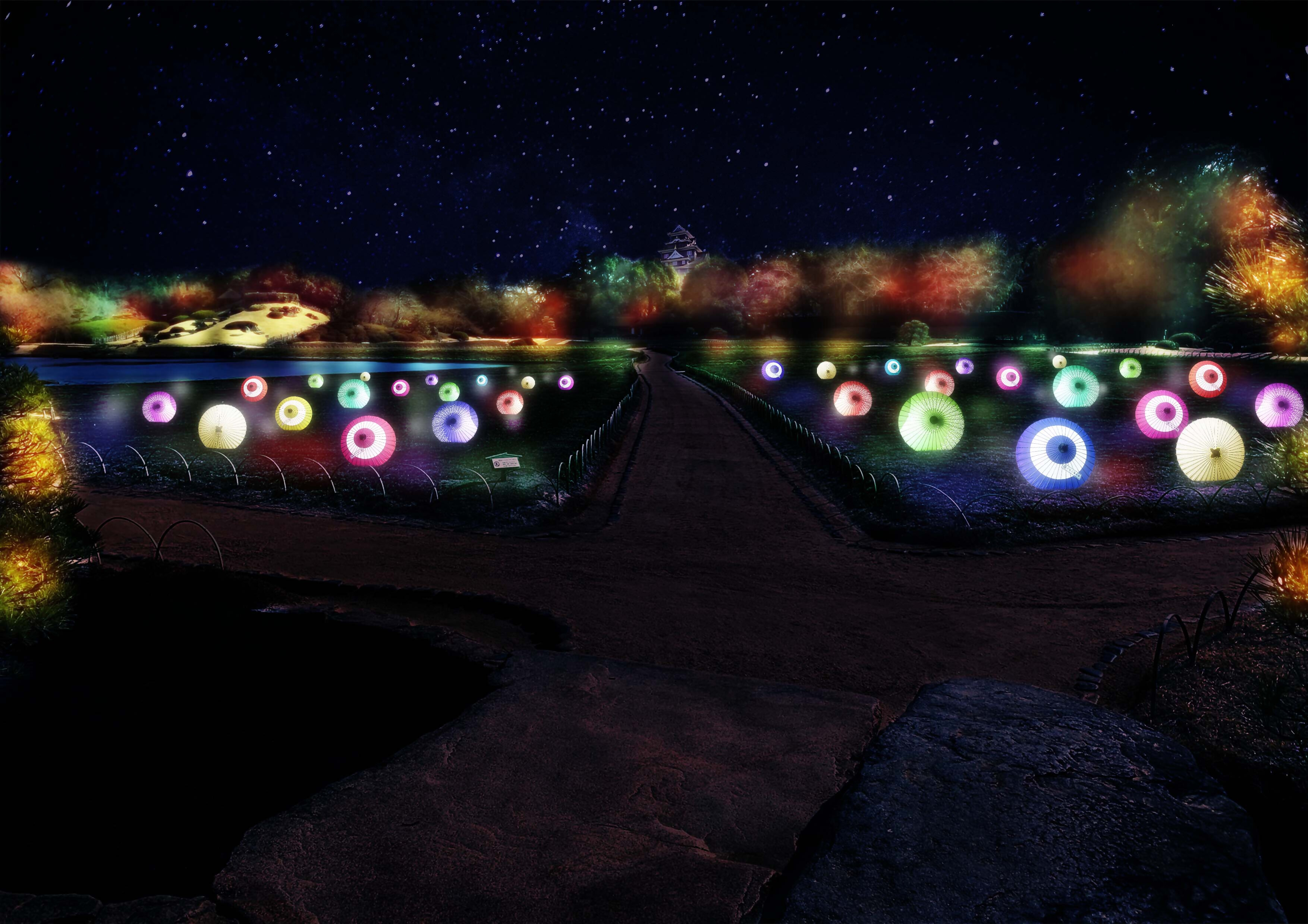 彩宵(いろよい)和傘 -2025- 紅葉に合う色とりどりの和傘と、赤・白の和傘を織り交ぜて設置し、秋らしさを創出。 ・開催日/令和7年11月14日(金曜日)~24日(月曜日・休) ・時間/17:00~20:30 ・場所/芝生エリア ※写真はイメージです