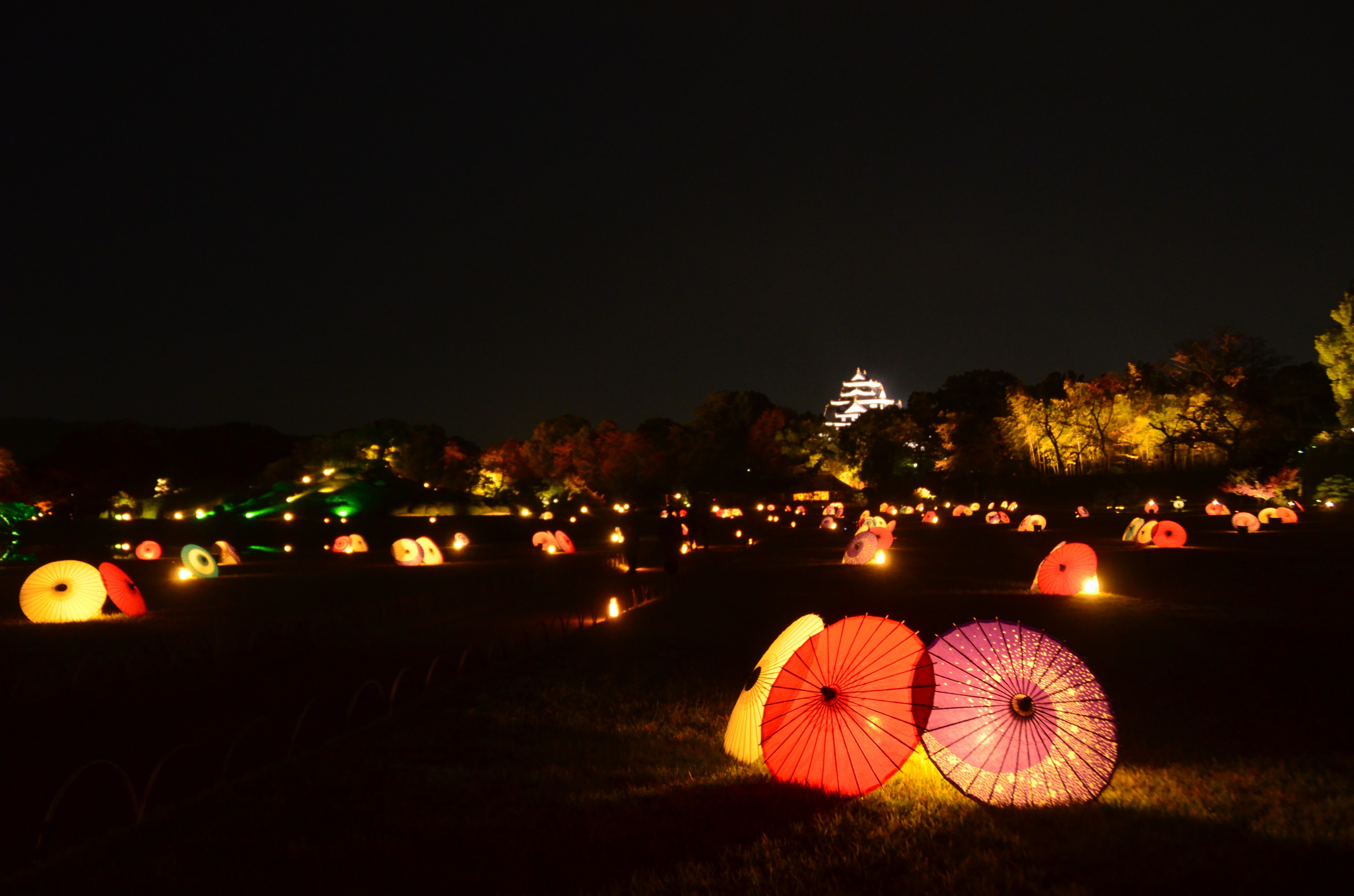 彩宵(いろよい)和傘 -2025- 紅葉に合う色とりどりの和傘と、赤・白の和傘を織り交ぜて設置し、秋らしさを創出。 ・開催日/令和7年11月14日(金曜日)~24日(月曜日・休) ・時間/17:00~20:30 ・場所/芝生エリア